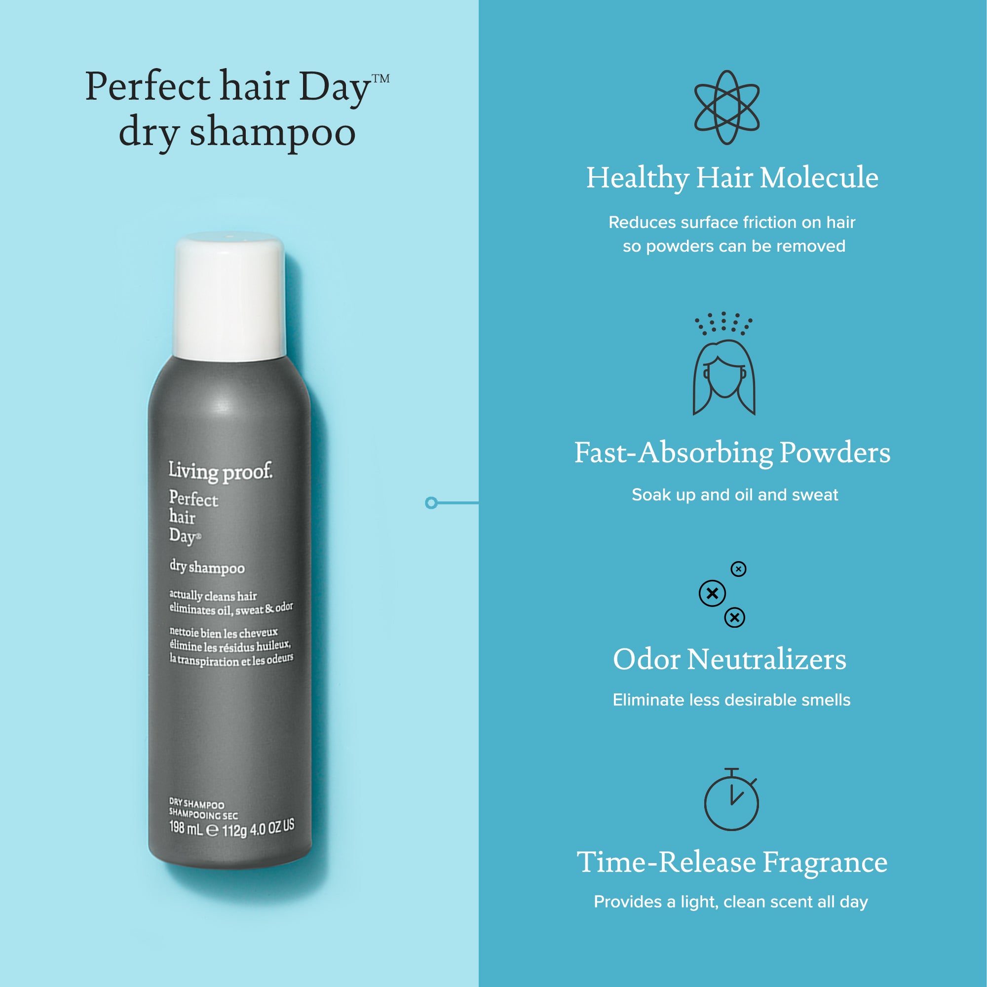 What it is formulated to do: Living Proof Perfect Hair Day Dry Shampoo contains fast-absorbing powders that soak up oil and sweat. Great for all hair types and colors, a patented OFPMA molecule reduces the surface friction on hair—leaving virtually no visible residue or powdery build-up—making it easy to remove the powder. Odor neutralizers eliminate unwanted smells, and a time-release fragrance releases a light, refreshing, long-lasting scent.